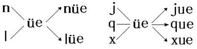 1.n──üe──nüe j──üe──jue l──üe──lüe q──üe──que x──üe──xue (复习j q x碰上ü,两点省略规则。)