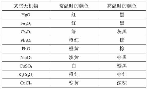 取5个试管。第一个试管装2mL试剂浓盐酸,以后的试管都取2mL浓盐酸,用水按体积比1∶1,1∶2,1∶3,1∶4稀释后,再分别加入少量相同量的Fe2O3粉末,振荡、静置观察,你会发现:Fe2O3与浓盐酸反应十分发慢,1∶1稀盐酸更慢,更稀的盐酸几乎观察不到有反应的迹象发生(溶液近乎无色),如果用CO还原Fe2O3的时间短,比如0.5min,2min,Fe2O3还原不完全,留下的Fe2O3仍呈红色,当用稀盐酸和CuSO4溶液检验黑色粉末的成分时,未反应完的红色的Fe2O3无疑会有所干扰。有一个事实想必不一定为多数人熟悉。把半药匙红色Fe2O3粉末,或一些橙黄色的铁锈放在试管中加热,你会发现,红色的Fe2O3或橙黄色的铁锈会迅速即变黑,冷后又迅速恢复成加热前的红色和橙黄色。不仅是红色Fe2O3,事实上很多无机化合物的颜色,往往随着温度的升高颜色变深(见下表)[5]。