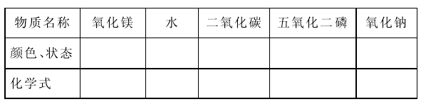 【引导】什么是化合物? 下表中的物质都是我们在前面实验中所接触过的化合物, 请描述它们的颜色、状态, 并写出其化学式。