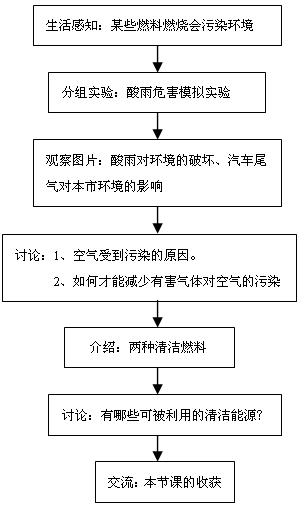 [课堂小结] 谈谈这节课你的收获? | 学生发言。 学生回忆,发言。 学生小组操作实验。 认真观察、记录现象。 讨论交流、得出结论。 观看图片,进一步认识酸雨的危害。 观看图片,感受太原市的污染状况。 学生思考、发言。 学生思考、发言。 学生讨论、交流、小组代表发言。 学生思考、发言。 学生认识并记忆。 学生讨论、交流、代表发言。 学生发言,归纳。 学生听讲,了解。 学生讨论、交流,代表发言。 学生阅读,了解。 学生讨论、发言。 观察图片。 学生发言谈收获。 | 初步感知生活中燃料燃烧对坏境的影响。 发扬小组合作精神培养动手能力、观察能力、分析能力、表达能力。 对酸雨造成的危害产生心灵的震憾,从而形成爱护环境、保护环境的思想。 对我们生存的环境有清醒的认识。 明确造成我们生活环境污染的主要因素,并分析解决的方法,从而从学生内心唤起保护环境从我们身边做起的紧迫意识,同时激发对使用清洁能源的渴望。 培养表达能力。 知道几种清洁燃料及其优点。 培养表达能力。 培养知识归纳能力、表达能力。 培养分析对比能力,知道在化学燃料中,天然气是比较清洁的燃料。 了解我国在改善大气环境,提高人民生活质量方面所作的工作培养爱国主义情感。 认识人类对新能源的开发和利用。 提出希望,给学生鼓励,引导努力奋斗的方向。 知识和情感升华。 |