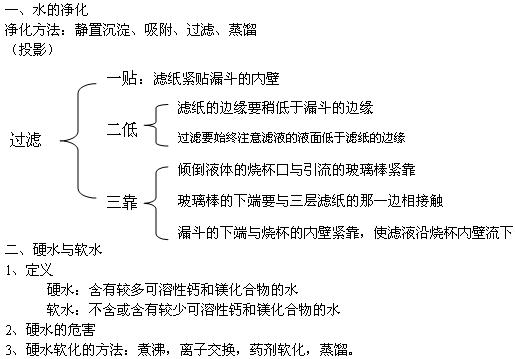 2、懂得纯净水和自来水的区别,学会用肥皂水鉴别硬水与软水,知道硬水的危害及硬水软化的方法。