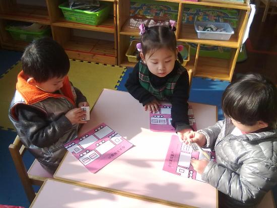 今天,请宝宝给小火车装上窗户,活动之前,请宝宝观察图片上的内容,有的说:“火车下面有圆圆的轮子。”有的说:“火车是连在一起的。”在给幼儿示范时,老师提醒幼儿找一找没有窗户的车厢,在操作环节中,我们的宝宝都为小火车“装窗户”,当他们看到自己亲手装扮的窗户时,也体验到成功的快乐。