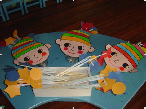 1、 自制小丑三个,并在帽子上标有不同标记。