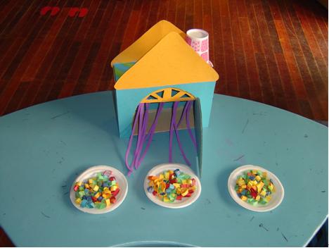 1、 利用较大的废纸箱自制房子一个,上面开有窗户。