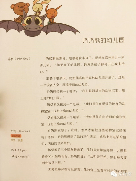 1.熊奶奶很喜欢小动物,她想在森林里办一家幼儿园。“办了幼儿园,谁家的孩子都可以让我来带啦。”熊奶奶想。