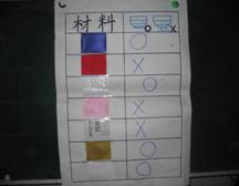 3)、利用记录单,教师进行小结,帮助幼儿梳理实验结果,找出防水和不防水的材料,并对有疑义的材料进行验证。