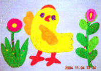 师:老师为小朋友准备了故事里的小鸡、小鸭、小金鱼和荷花,它们都想和你们做好朋友,小朋友可以选一个好朋友用盘纸的方法把它们盘出来。(同时出示画好的图案)