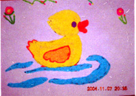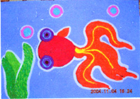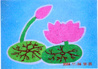 3、鼓励幼儿盘完后大胆添画,引导幼儿画面上再加上一些什么会更漂亮。(用彩笔添画或用盘纸方法添画)