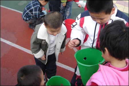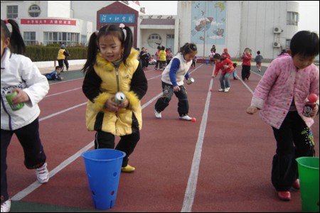2 玩一段时间之后,教师集中幼儿,请幼儿讲讲“如何在快走的过程中,使球在易拉罐上面不掉下来?”教师引导,使孩子明白:身体和手在快走的过程中要保持平衡。