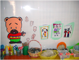 注:活动室的中央有一面很显眼的墙,而且有比较大的活动空间,适合布置主墙饰,于是,我们的活动就从布置主墙饰开始。