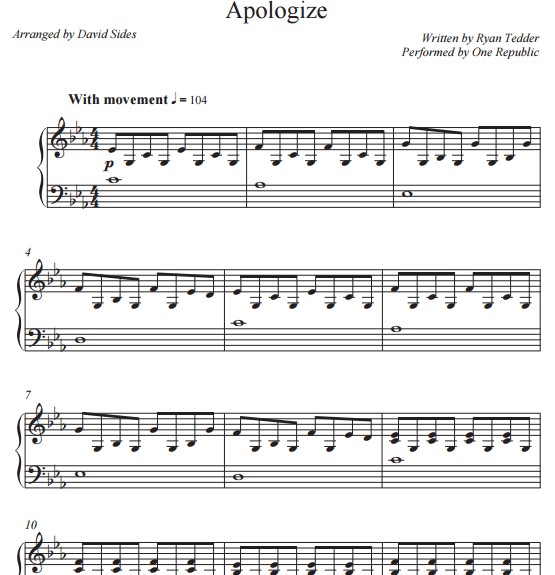 Arranged by David Sides With movement q = 104 Written by Ryan Tedder Performed by One Republic Apologiz