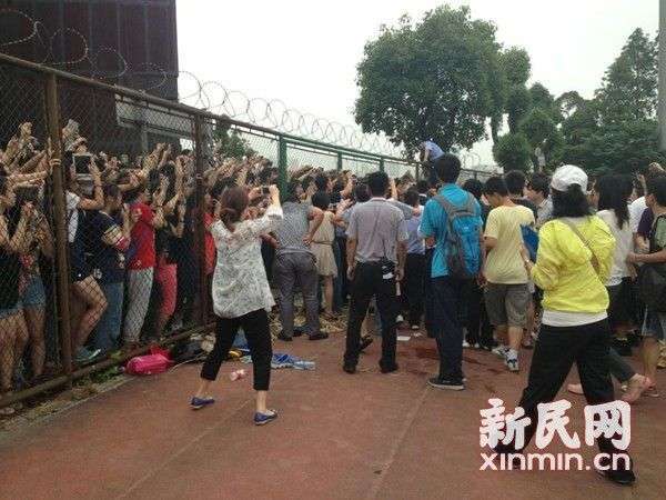 稍后,贝克汉姆进入球场,门一开,学生就集体向大门拥挤,数名保安和警察组成人墙维持秩序。在此过程中,有的保安被摔在地上,后面的人一拥而上。现场发生踩踏情况,至少造成五六人受伤。记者看到,现场一名警察满脸是血躺在地上。体育场的入口处,堆满了鞋子、包等留下的物品。