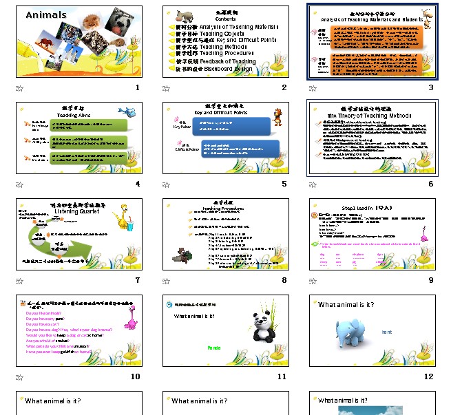 通过分析1,2,3班学生现有的语音、词汇、语法基础,了解他们本课听力理解方面所存在的语言障碍;以及学生所缺乏的本课相关的文化背景知识,确定本课听力材料的难易程度对于1,2班的学生来说为“中”,对于3班的学生来说为“易”。因此在教学任务和教学过程上会有所区别,本课件主要是针对1,2班学生制作的。