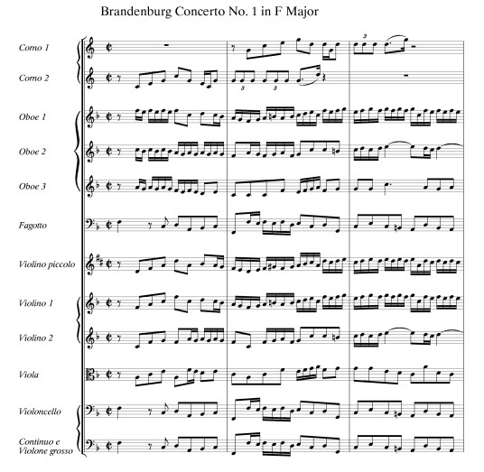 这一套协奏曲,第一号,F大调,BWV1046,乐器编制:主奏:两把圆号、3支双簧管。协奏群:第一、第二小提琴(第一小提琴另加Violino Piccolo,就是比现代小提琴调高三度的小型小提琴)、中提琴、数字低音(低音管、大提琴、低音提琴、大键琴)。此曲共4个乐章:1,快板(此速度并非巴赫所写,巴赫手稿中这一乐章无速度标记),其中独奏群与合奏群并无明显对立,是以开始的叠句的反复出现构成。2.慢板,以圆号展开,高音小提琴时而脱离第一提琴独立活动,具抒情风格修饰的旋律由双簧管开始,移至高音小提琴再移至低音乐器,调性逐次五度下移,在双簧管、高音小提琴、低音乐器之间形成精美的赋格,结尾是双簧管的一段花奏。3.快板,吉格舞曲节奏,这一乐章的高音小提琴声部特别华丽,似乎是为这件乐器而作的协奏曲。4.小步舞曲,一个优雅的小步舞曲以回旋曲方式与3个三声中部交替出现,结构为小步舞曲-第一个三重奏(管乐器两支双簧管和一支低音管)-小步舞曲-波拉卡-第二个三重奏(两支圆号与一支双簧管)-小步舞曲。