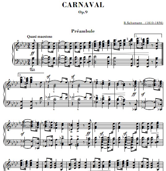 全名为《狂欢节:四个音符的小场景》Carnaval: Scenes mignonnes sur quatre notes ,舒曼称之为“较高级的蝴蝶”,共包括二十一首小曲,且每一曲均有标题。