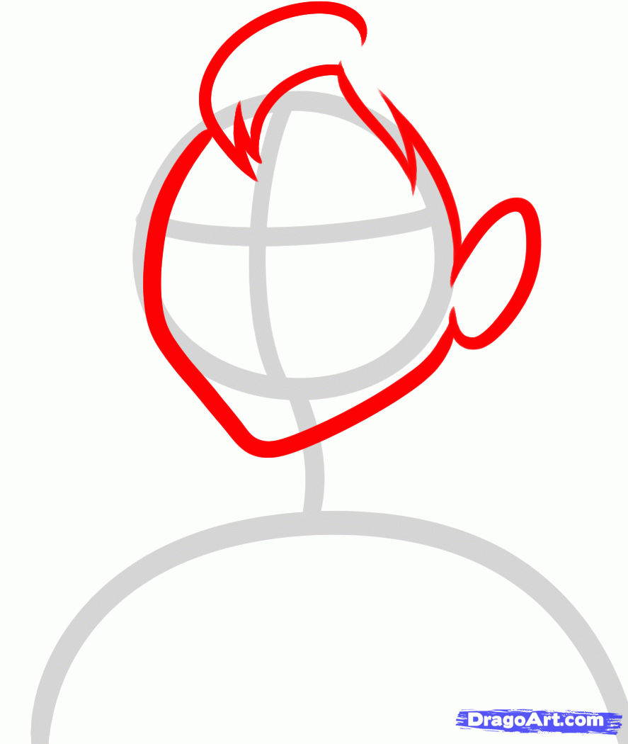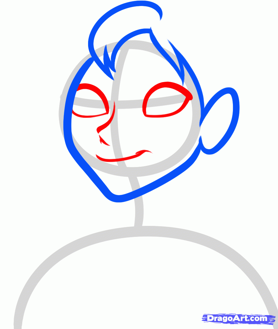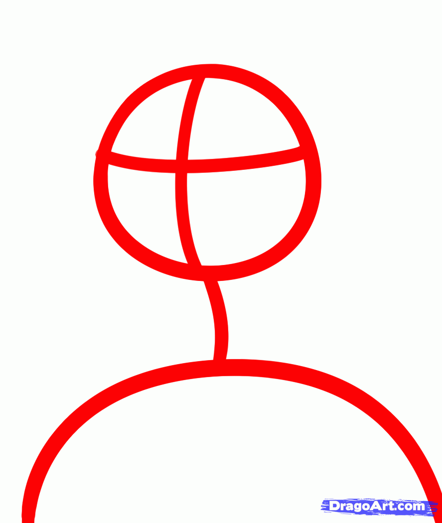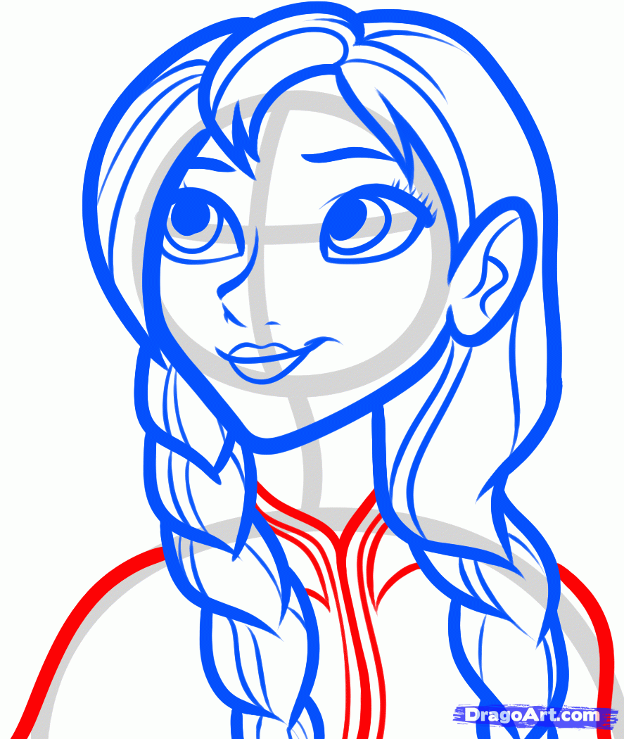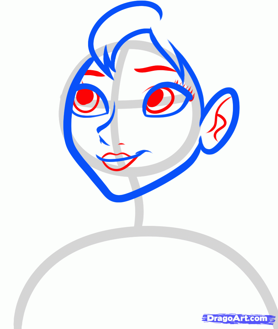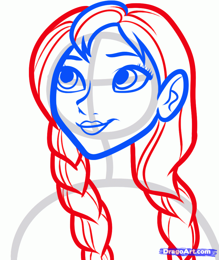 To draw Anna we will need to start with a circle for the head, then draw the arched lining for the shoulders. Attach a neck, then sketch in the facial guidelines.