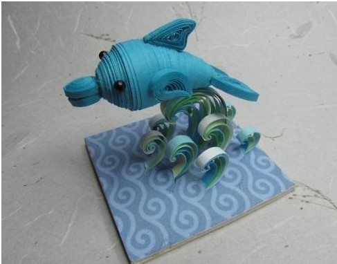 10.最后将前面制作好的衍纸海豚粘贴到上面,这样一个漂亮有趣的衍纸海豚就完整制作完成咯!其他有趣好玩的衍纸制作推荐:衍纸吉他手工制作教程。