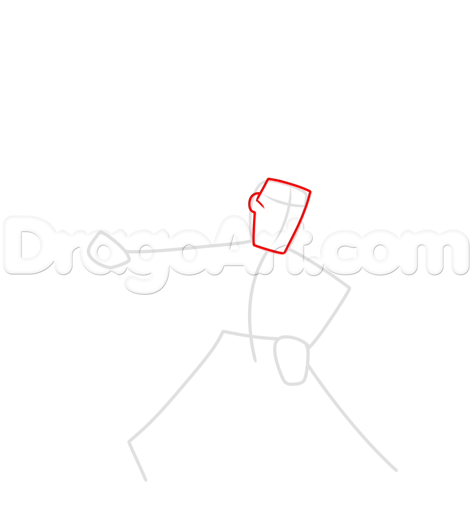 步骤4。我们现在将画上他的武士的躯干。画一个他厚的脖子的形状,然后画的肩膀,袖子,和其他的衣服,形状像一个钟。