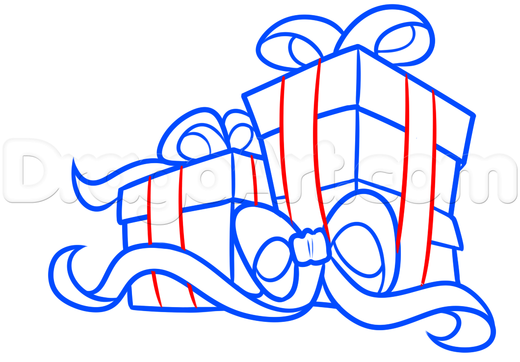 For the last drawing step all you have to do is draw the ribbons down the sides of each gift. When that is done erase your mistakes.