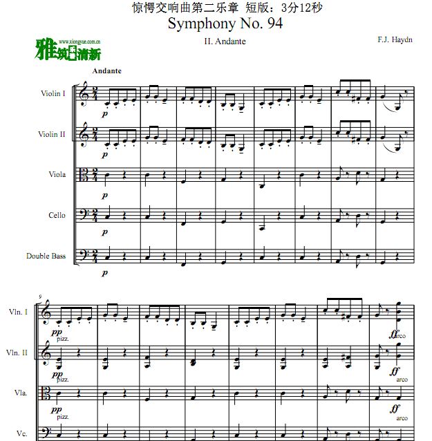 海顿 惊愕交响曲第二乐章 小提中提大提低音提琴 弦乐五重奏谱 短版:3分12秒