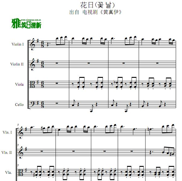 现将此曲目编制成《花日》二小提琴一中提琴一大提琴的弦乐四重奏谱,此弦乐四重奏版本的《花日》不仅体现了曲子优美动人的朝鲜传统民谣旋律,也表达了黄真伊对爱情和人生的感悟,让人感到柔情和感伤。