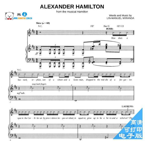 琴譜 Sheet Music Alexander Hamilton弹唱钢琴谱 楽譜 五线谱 钢琴谱 PDF格式 共10页 高清晰版 可打印