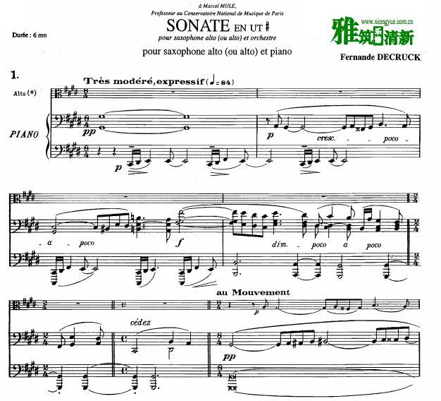琴譜 Sheet Music 流行音乐乐谱 楽譜 五线谱 Fernande Decruck - saxophone sonata in C-sharp Minor钢琴伴奏谱 德克鲁克 升c小调中音萨克斯钢琴伴奏谱 PDF格式 共9页 可打印