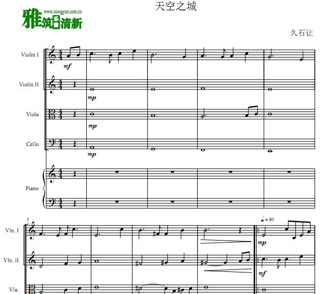天空之城 君をのせて 伴随着你弦乐钢琴五重奏谱