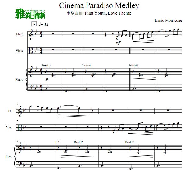 Cinema Paradiso Medley 天堂电影院串烧First Youth, Love Theme长笛中提琴钢琴三重奏谱