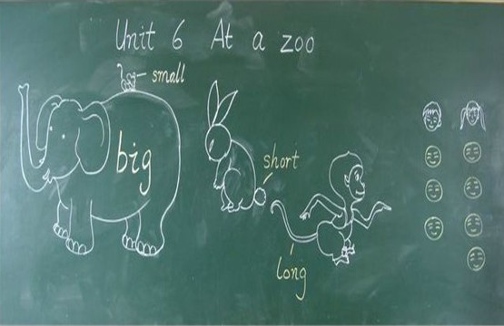 板书有助于保持记忆,防止遗忘。心理学研究表明,人在获得外部信息时,不同器官所发挥的作用有所不同。其中由视觉获得的信息占83%,由听觉获得的信息占11%,由其他器官获得的信息占6%。板书以直观手段使抽象的学习材料形象化,真实地展现在学生面前,能很好地刺激学生的思维,加强学生的记忆效果。而且教师在口头表达的基础上结合板书,能使学生各种感觉器官都充分参与到教学中去,因此大大地加强学生记忆的效果。例如在教PEP BOOK 2 UNIT 6 AT a zoo时,如果教师直接跟学生说big就是大的意思,很难让学生把这个抽象的单词记住,而且学生也会很快把单词big遗忘了。为了让学生更好地记住本课单词,我先在黑板上用简笔画画了一只很大很夸张的大象,先把学生的注意力集中起来,然后在大象身上写上单词big使原来抽象的单词一下子变得直观起来,这样有助于学生的形象记忆。接着我在大象背上画一只特别小的老鼠并说:“Is it big ?”然后才引出单词small,通过这样夸张的对比板书方式,让学生更容易理解本课单词的意思,也牢牢地记住了所学单词,这样就大大地加强了学生的记忆效果,降低了学生对单词的遗忘速度。(如图)在我所教的学生当中,他们对这样的板书设计特别感兴趣,也会在自己的笔记本上画上这些有趣的小动物,帮助自己记忆单词。