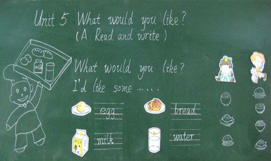 新颖、独特的板书设计很容易使学生不断产生新的视觉冲击,缓解他们视觉上和心智上的疲劳,使他们精力充沛地高效地完成一节课的学习。因此板书设计不能千篇一律,一成不变,更不能生搬硬套。在教学中,教师应该根据教学内容和教学条件的不同,灵活地采用不同的板书形式,例如:有多媒体的教师,可利用现代化的教学手段,设计优美的字体、不同的色彩、相应的图片和不同的显现形式,形象直观地突出重点。教学条件较差的教师,也可根据自己的实际,动手制作一些简单的图片教具。目的是用灵活多样的形式集中学生的注意力,使学生有耳目一新的感觉,从而大大地调动学生的学习积极性和主动性。例如在教授有句子和单词的课文时,我通过图文结合的方式进行板书,把重点句子和单词一起合理地写在黑板的主要区域上,并在辅助区域用简笔画画上相关的图画,使板书更美观。例如在教PEP BOOK 3 What would you like ? 这一课时根据实际情况我用了以下图文结合的板书。