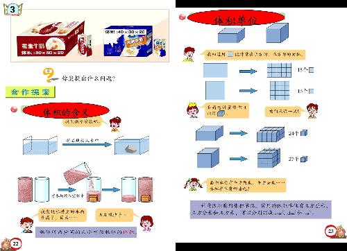 对于这节课,教材是借助两个大小不同的牛奶包装箱,从学生的生活实际出发,通过两个问题,逐步学习体积的含义和体积单位。