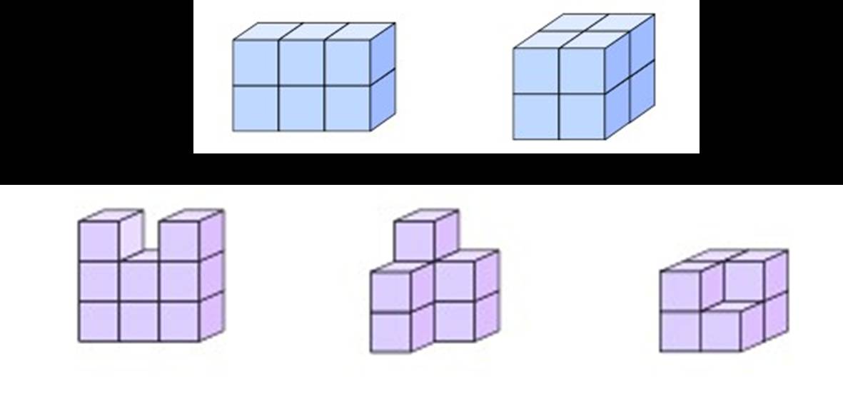 当不能直观判断两个物体体积大小时,该怎么办?这就是我们探究的第二个问题,这时候我们要引导学生回忆已有的知识经验,利用测量面积的方法来测量体积,可以用小正方体摆一摆。开始采用大小不一的小正方体来摆,引起认知冲突,引发学生思考。
