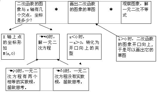 先复习提问“X轴上点的纵坐标是什么?”,接着直接给出一个简单的例子“求的图象与x轴的交点”,尽力调动绝大多数学生的积极性,引导学生由熟知的求二次函数的图象与x轴的交点的坐标开始主动的参与本节的学习。要求学生动手求交点。