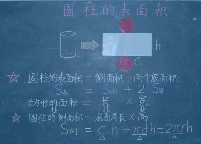 首先通过实物问学生圆柱的表面积是指哪些部分呢,引出板书课题及表面积的公式。让学生先形象感知圆柱的展开形状,再抽象概括,结合学具的实物摸一摸,看一看,为下面的教学埋下伏笔。接着让学生动手剪一剪,把圆柱的表面展开板书出来,把它转化成平面图形,转化的方法是学生学习的重要方法,把新的问题转化成学过的问题是学生解决问题的重要方法。动手操作激发学生的主动性,培养学生的空间思维图形三维的转化。