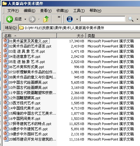 人美版高中美术课件20课,电子版本(ppt文档格式,20个文件80多M),以电子邮件形式发送.