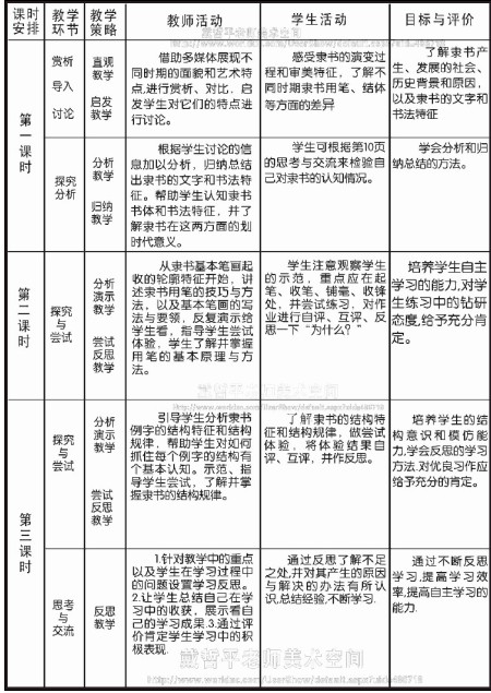 本课的教学重点是了解隶书的审美特征、难点是用笔技法和结构规律的学习运用。力求通过课中、课后的反复练习,使学生从笔法和结构上较准确地把握隶书的审美特征,写出合乎基本要求的隶书。宜采用直观教学、启发教学,并注重对学生探究精神和学习兴趣的培养。