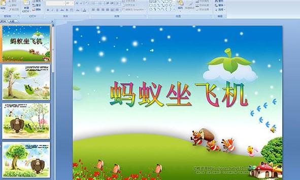 突然,刮来一阵大风,吹跑了绿叶,带走了三只蚂蚁。绿叶飞啊飞,三只蚂蚁像坐着飞机,可带劲啦!