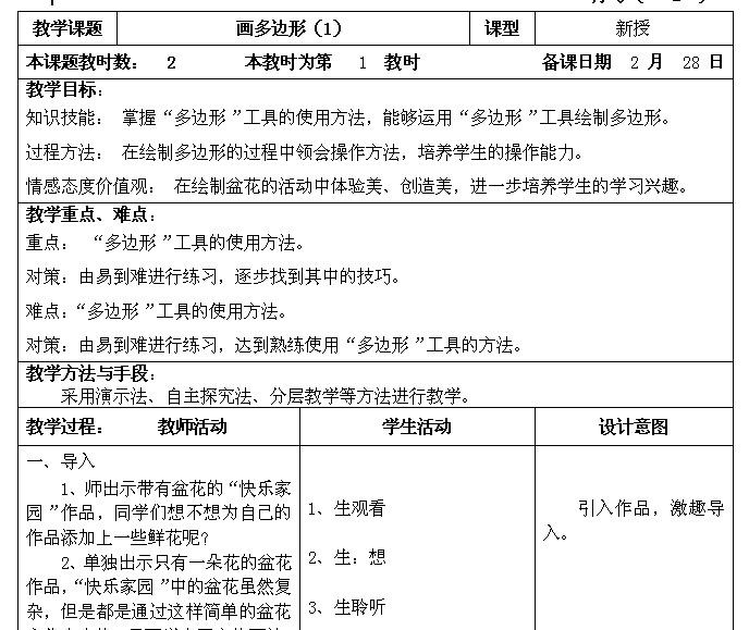1常规教育 2画多边形(1) 3画多边形(2) 4复制与粘贴图形 5调整图形 6组合图形 7修饰图形 8创作图画(1) 9创作图画(2) 10遨游因特网(1) 11遨游因特网(2) 12下载网上信息(1) 13下载网上信息(2) 14网络文明小公民 15下载和安装软件 16复习 17考查 点击下载此文件