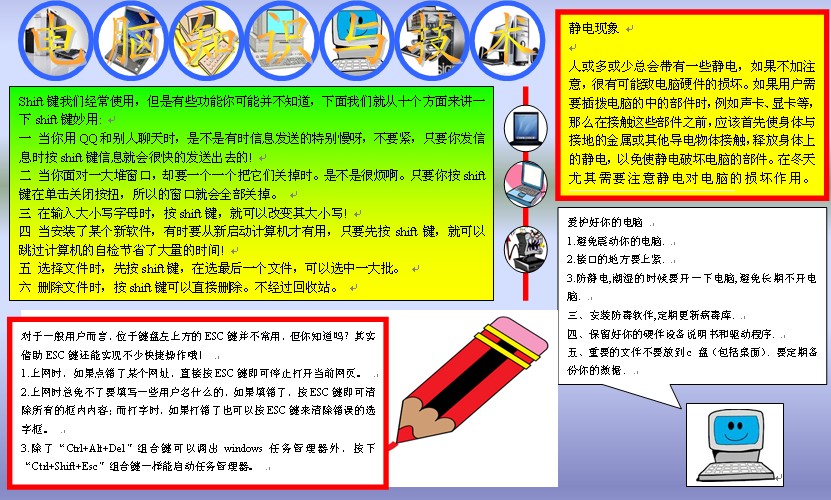 爱护好你的电脑 1.避免震动你的电脑. 2.接口的地方要上紧. 3.防静电,潮湿的时候要开一下电脑,避免长期不开电脑. 三、安装防毒软件,定期更新病毒库. 四、保留好你的硬件设备说明书和驱动程序. 五、重要的文件不要放到c 盘(包括桌面).要定期备份你的数据.