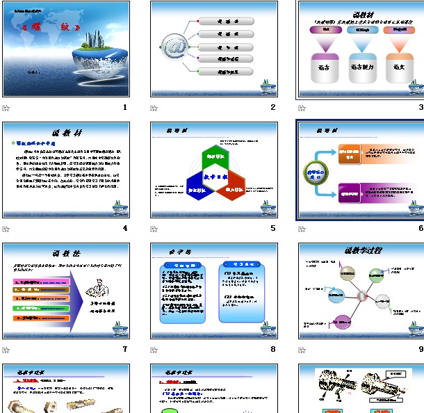 螺纹的地位和作用 螺纹这节内容是选自高等教育出版社出版的全国中等职业教育教材《机械制图》第五章“零件图的表达与识读”的第五节。对图样中常用螺纹的参数、画法和标注方法作了详细地介绍,是学生提高识图能力与绘图能力的重要章节,对全面地掌握零件图的表达与识读起着至关重要的作用。 螺纹这一节是一个基础内容,主要学习螺纹基本要素和表达方法,让学生更全面地了解螺纹这类零件。在此之前,学生们已经学习了组合体视图和图样的基本表示法等内容 ,这为过渡到本章内容的学习起到了铺垫的作用。