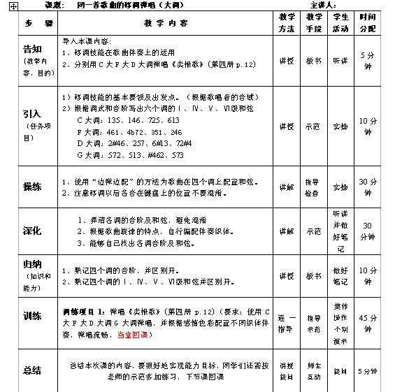 能够运用移调知识,将同一首大调歌曲在C大F大D大G大调上弹奏。 总结、巩固、提高前面所学四个大调,熟记四个大调的音阶以及Ⅰ、Ⅳ、Ⅴ、Ⅵ级和弦,并区别开,为歌曲配置伴奏并弹唱。