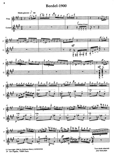 《探戈的历史》Histoire du Tango 是皮亚佐拉于1982年受古井和义丹的委托为吉他与长笛而作的组曲,现在已经成了吉他和长笛音乐会中必不可少的作品。作品采用了长笛和吉他的几种现在演奏法,创作出色彩丰富的世界。根据探戈的发展历史,分成四个乐章。