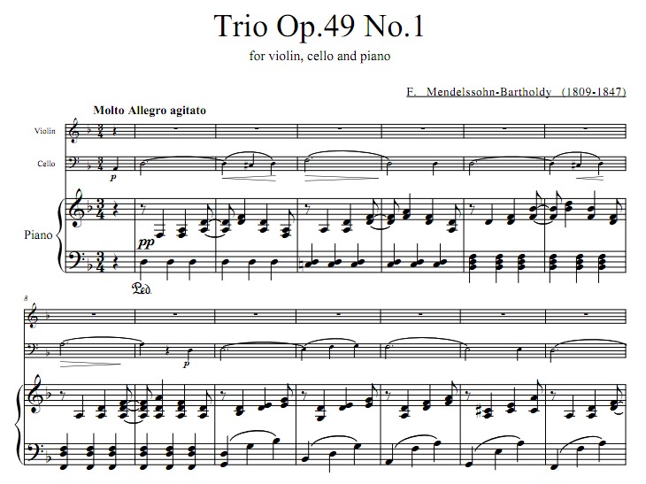 门德尔松《d小调第一钢琴三重奏 Op.49》原版钢琴三重奏总谱+分谱