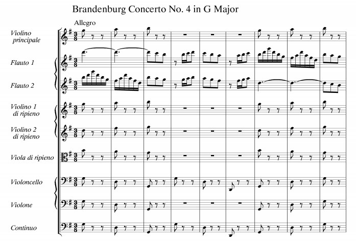 第四号,G大调,BWV1049,乐器编制:主奏小提琴、竖笛(直笛)各2。协奏:弦乐合奏、数字低音(管乐不加入)。这一首是这套协奏曲中最为轻快的一首,随后有小提琴带入新的动机,这一乐章中间部分是独奏小提琴激动人心的快速进行。2.行板,复合三段体,但各段没有明显的区分,充满装饰性的沉思气息。3.急板,是由赋格曲与意大利协奏曲的有机结合,其中小提琴华彩与优秀的赋格结构的交织可谓精美绝伦。