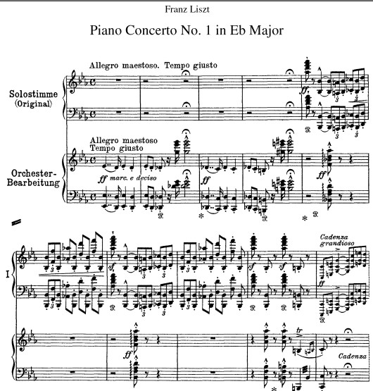 第一乐章 庄严的快板,降E大调,4/4拍子,自由的奏鸣曲形式。一开始就以全乐队的合奏强有力地呈示出第一主题,旋即由钢琴以富于华丽技巧的乐句来承接。随后,钢琴奏出的第二主题柔美动听,颇似奏鸣曲的副歌部分。两个主题经过交织反复后,速度逐渐减慢,直至乐章结束(直接进入下一个乐章)。