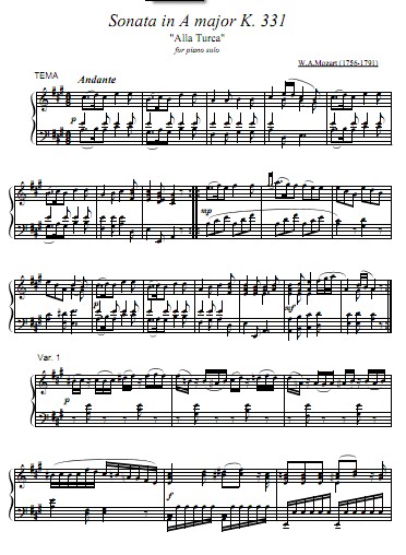 “土耳其进行曲”是其中一首最为人所熟悉的作品,其曲调流行于17、18世纪的欧洲。作曲家以模仿土耳其管乐团巡游时所奏的音乐加以改良而写成。当中钢琴手需要以一种称为“土耳其式停顿”(Turkish stop)的弹奏手法,以营造具敲击性的效果。莫扎特后来亦曾在歌剧《后宫诱逃》中使用这种曲调。