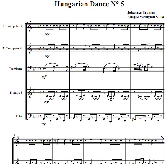 勃拉姆斯匈牙利舞曲第五号铜管五重奏总谱分谱