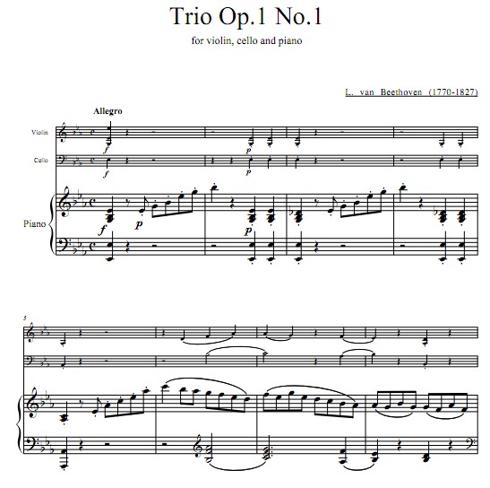 第一号钢琴三重奏,OP.1.1,降E大调,据推测大约是1792年前后的作品,OP.1的3首都呈献给李希诺夫斯基伯爵。