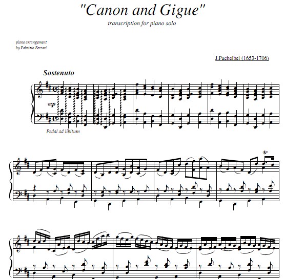D大调卡农与吉格,也称约翰·帕赫贝尔卡农(Pachelbel's Canon),是德国作曲家约翰·帕赫贝尔最著名的作品。因为它是最著名的卡农乐曲,有时也常以“卡农”代指。然而实际上卡农(Canon)并非曲名,而是一种曲式。卡农在字面上是“轮唱”的意思,吉格(Gigue)则是舞曲。